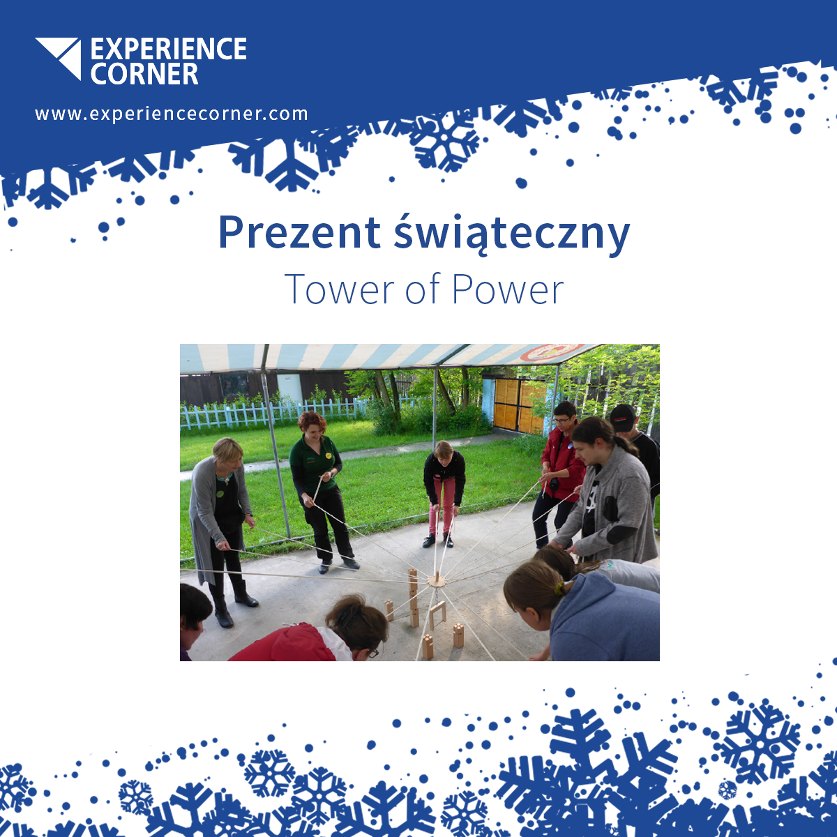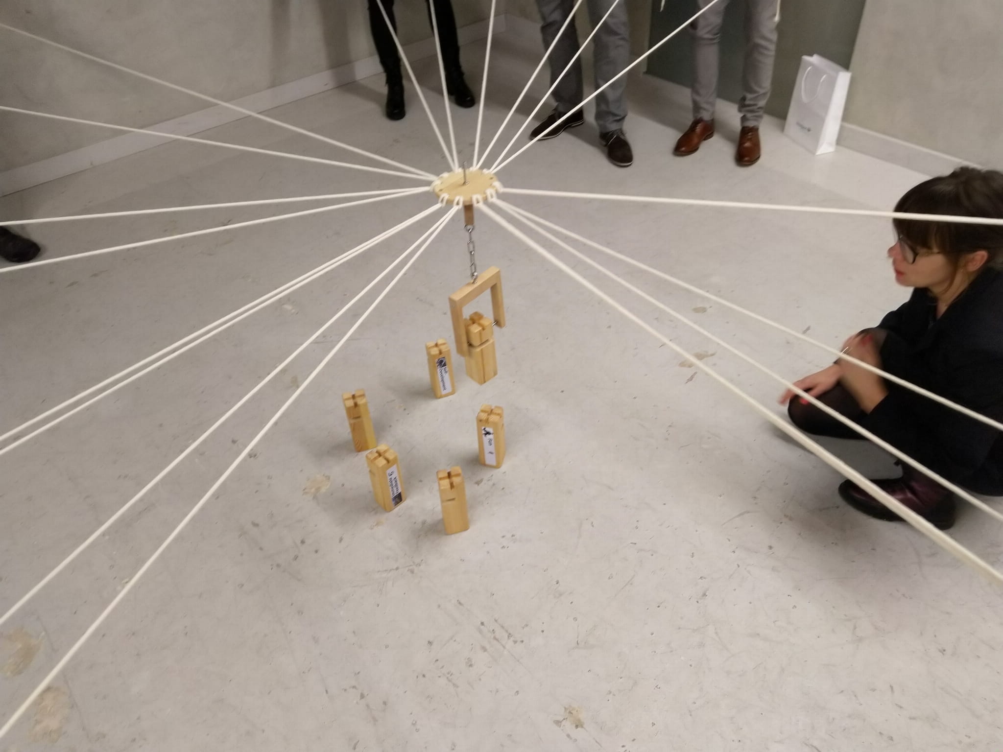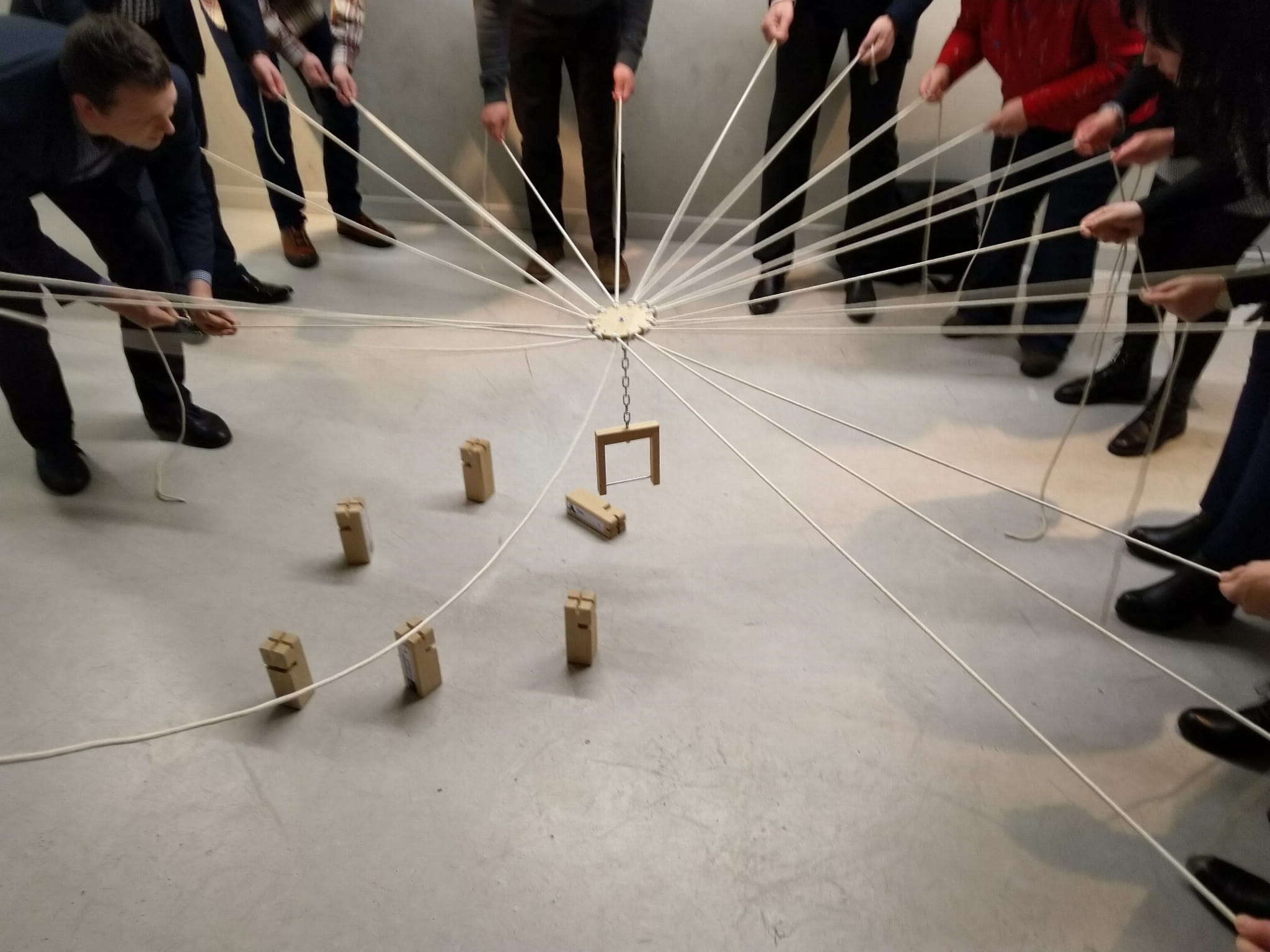 Team’s goal is to build a tower out of wood blocks by putting them on one another. This task is not as easy as it seems. Blocks have a hole – each of them has a hole, which is cut out differently. Each of team members is guiding a string, which is attached to special crane that lifts up the blocks. One cannot use hands or body to help himself. Thanks to team cooperation, planning, good communication – it is possible to control the crane, which allows the team to finish the exercise.