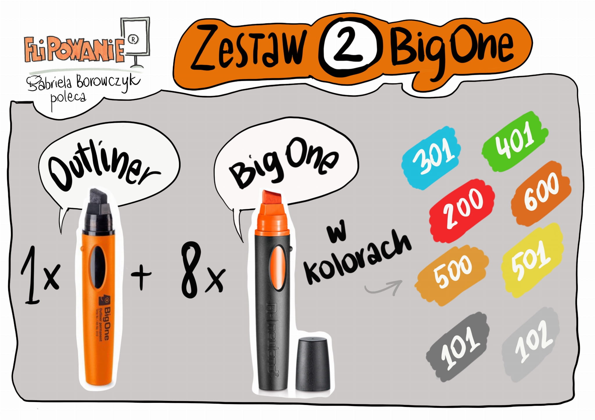 Nieodzowny zestaw flipującego trenera/ moderatora. Na serio. Kto był na moim warsztacie, wie, że BigOny rządzą – gruba kreska to szybki efekt; wypełnienie kształtu, podkreślenie napisu czy cieniowanie w wykonaniu BigOne to oszczędność czasu i efektywność pracy!