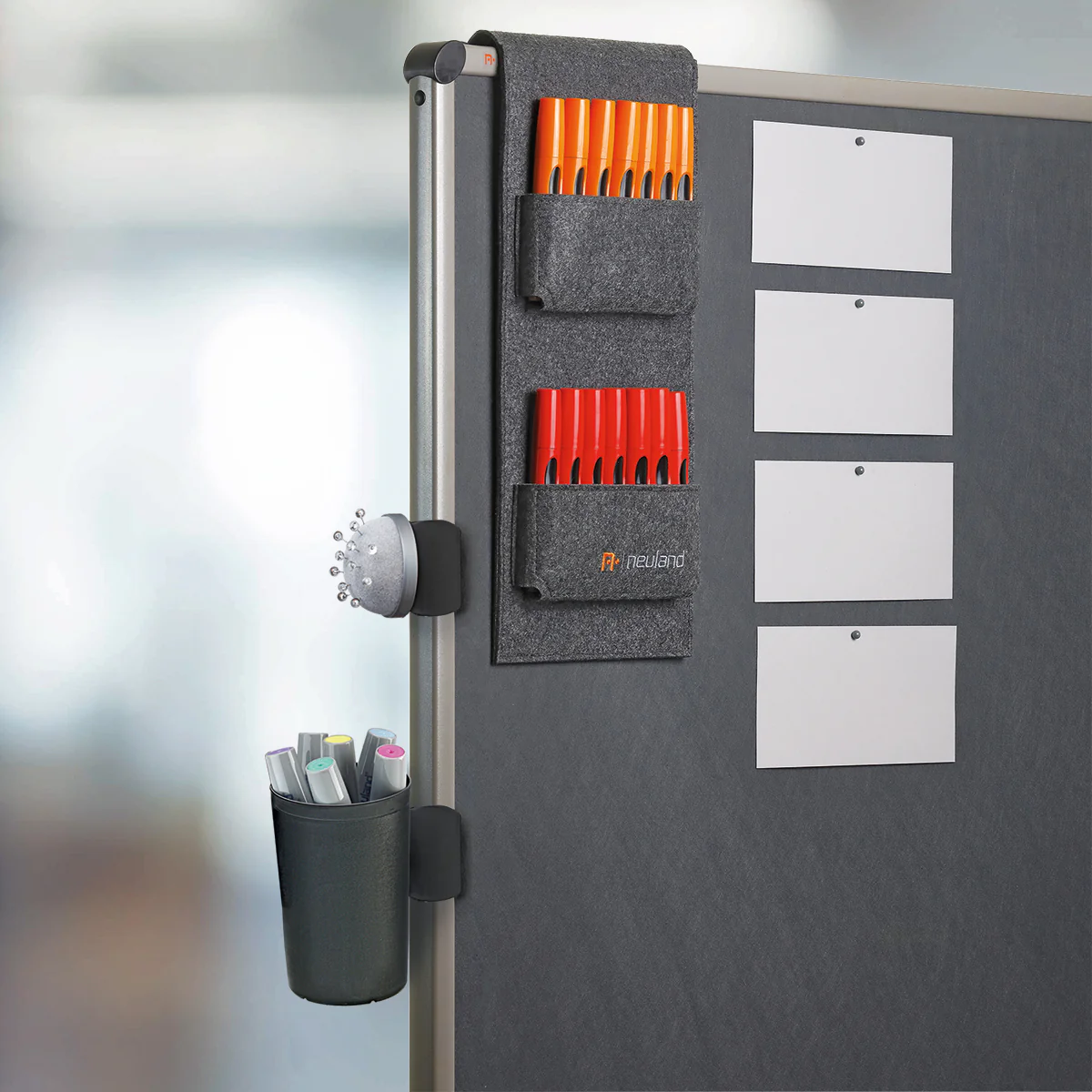Wielofunkcyjny pojemnik na akcesoria, który wystarczy przypiąć do ramy tablicy. Natychmiast tworzy łatwo dostępne miejsce na markery i inne małe przybory.